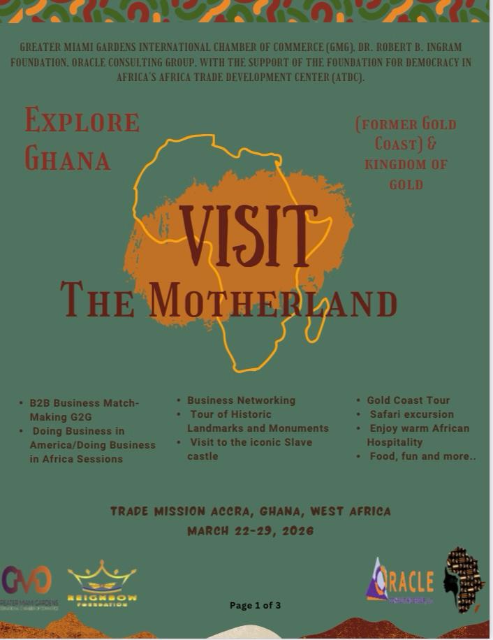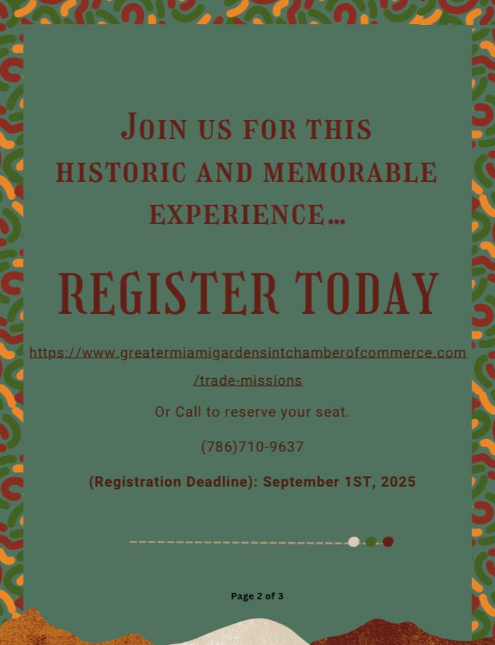 Trade Missions Contact the Greater Miami Gardens Chamber of Commerce for membership inquiries, business support, and international trade opportunities. REGISTER NOW
